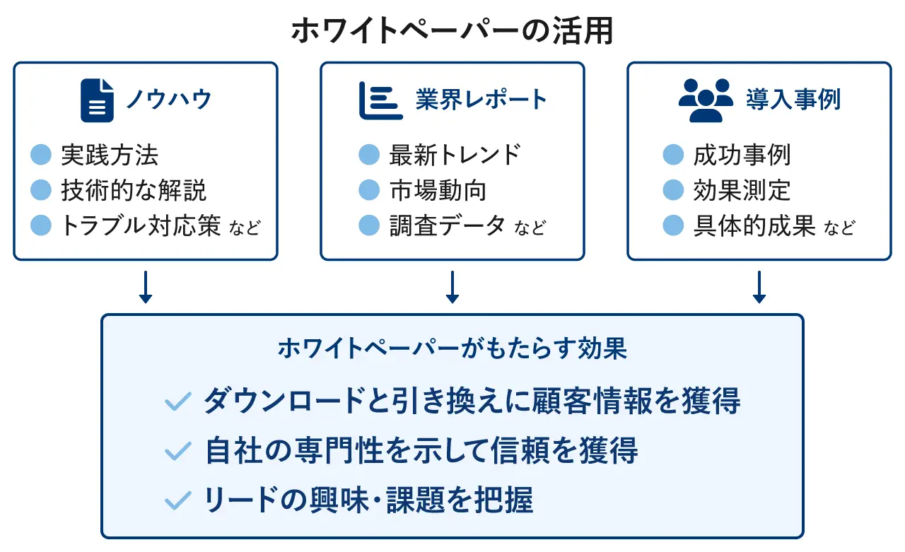 ホワイトペーパーは、自社の専門知識や調査データをまとめた資料で、見込み客により深い情報を提供するコンテンツです。ノウハウ集・業界動向レポート・導入事例集などが代表例です。