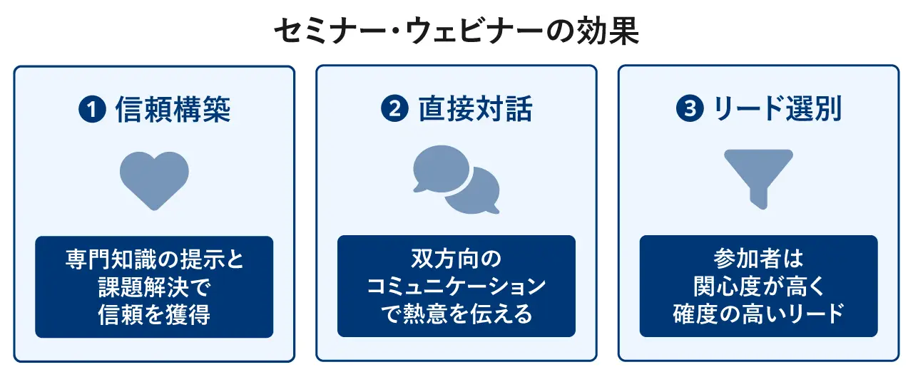 セミナーやウェビナーは、メールやWebサイトだけでは伝わりにくい、熱意や専門知識を伝えるために有益です。見込み客と直接コミュニケーションを取れる貴重な機会としても活用できます。