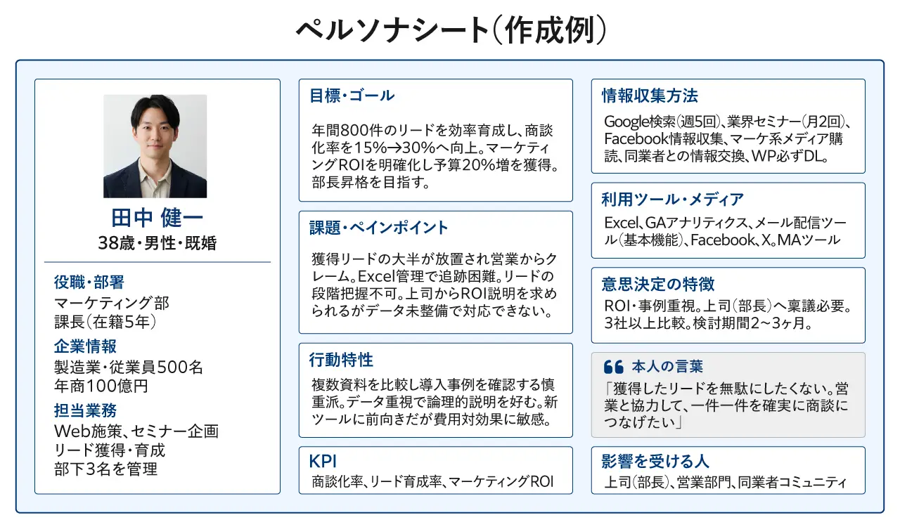 【ペルソナとカスタマージャーニーで明確にする要素】 ・ペルソナで顧客像を具体化する:ターゲット顧客像を描いた架空の人物モデル(ペルソナ)を作成します。職種・役職・悩み・情報収集経路などを具体的に設定し、チーム全体で顧客像を共有します。 ・カスタマージャーニーで購買プロセスを可視化する:ペルソナの認知から購入までの思考・行動プロセスを時系列でマップにします。ペルソナが各段階で何を考え、どう行動するかを具体的に書き出します。 ・各段階で必要な情報とチャネルを特定する:カスタマージャーニーの各段階でペルソナが感じる感情や、必要な情報を整理します。いつ何を提供すれば購買意欲が高まるかを明らかにしましょう。 |