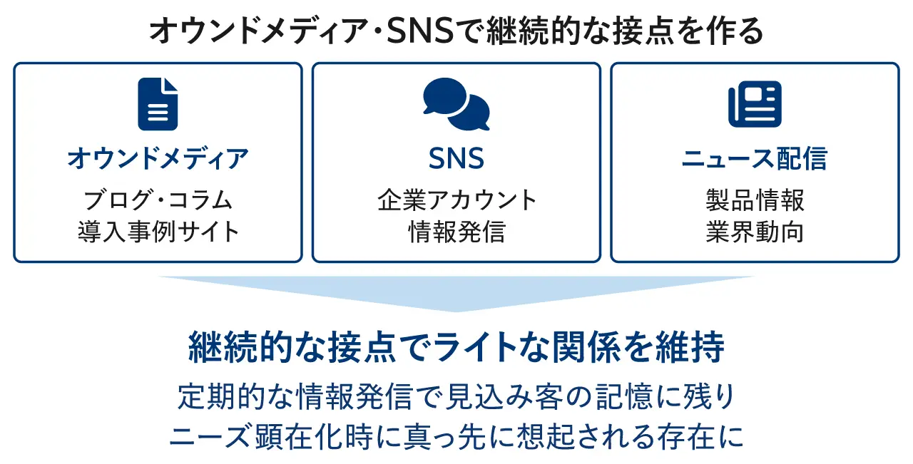 自社が運営するオウンドメディアやSNS公式アカウントの活用も、見込み客との長期的な関係構築に役立ちます。継続的な情報発信を通じて、ライトな接点を保ち続けるのに最適です。