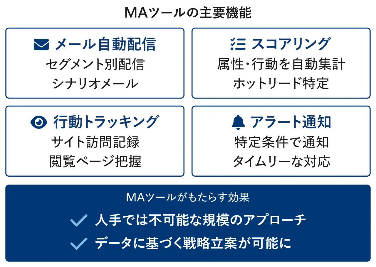 たとえば、メール配信の自動化・スコアリングの集計・サイト訪問のトラッキング・特定条件でのアラート通知などが、MAツールの得意分野です。
