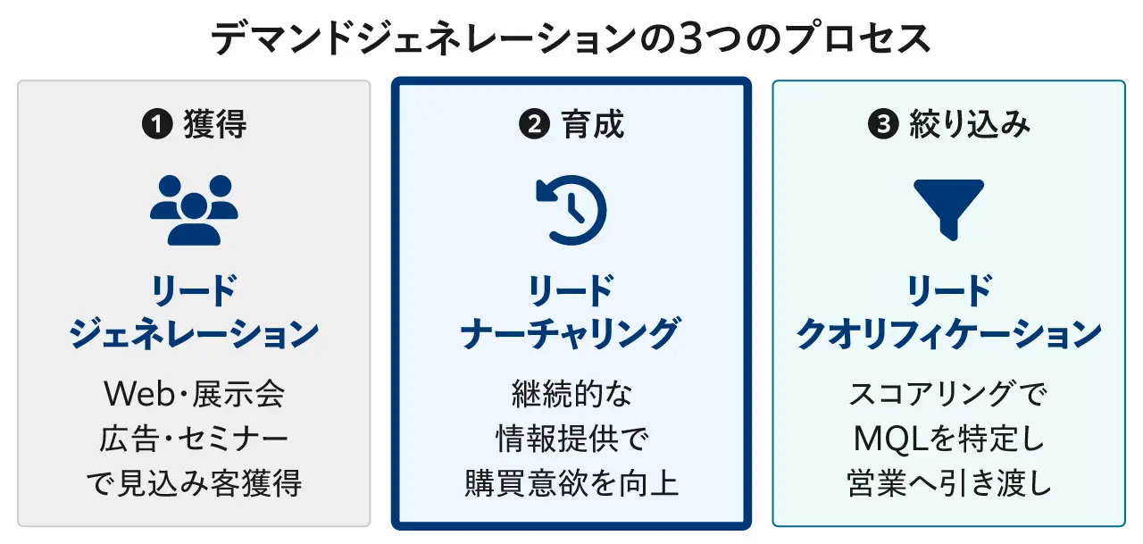 リードナーチャリングは、デマンドジェネレーション(需要創出)の中核を担います。デマンドジェネレーションは、見込み客の獲得から育成、絞り込みまでの一連のプロセスを体系化したフレームです。