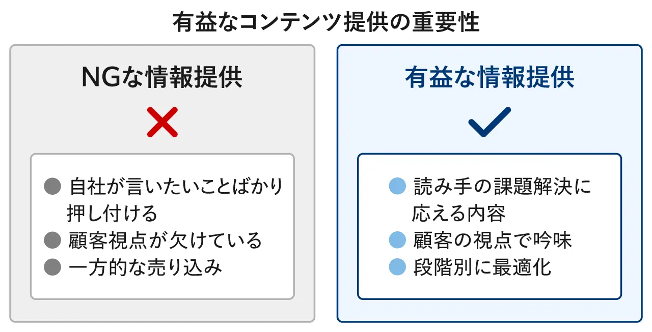 自社が言いたいことばかり押し付けるのではなく、読み手の課題解決や知識欲に応える内容になっているかを確認しなければなりません。常に “見込み客の視点” で、内容を吟味することが重要です。