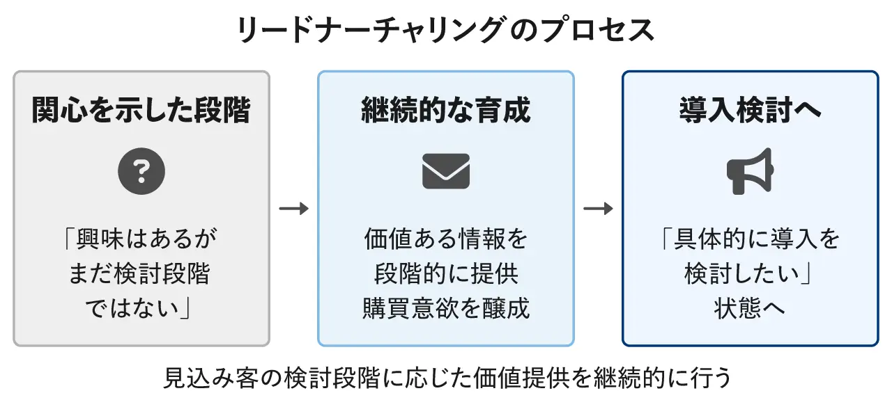 リードナーチャリングでは、単なる情報発信ではなく、見込み客の検討段階に応じた価値提供を行います。“今すぐ導入する状態ではない” リードを、 “具体的に導入を検討したい” 状態へと変化させることが狙いです。