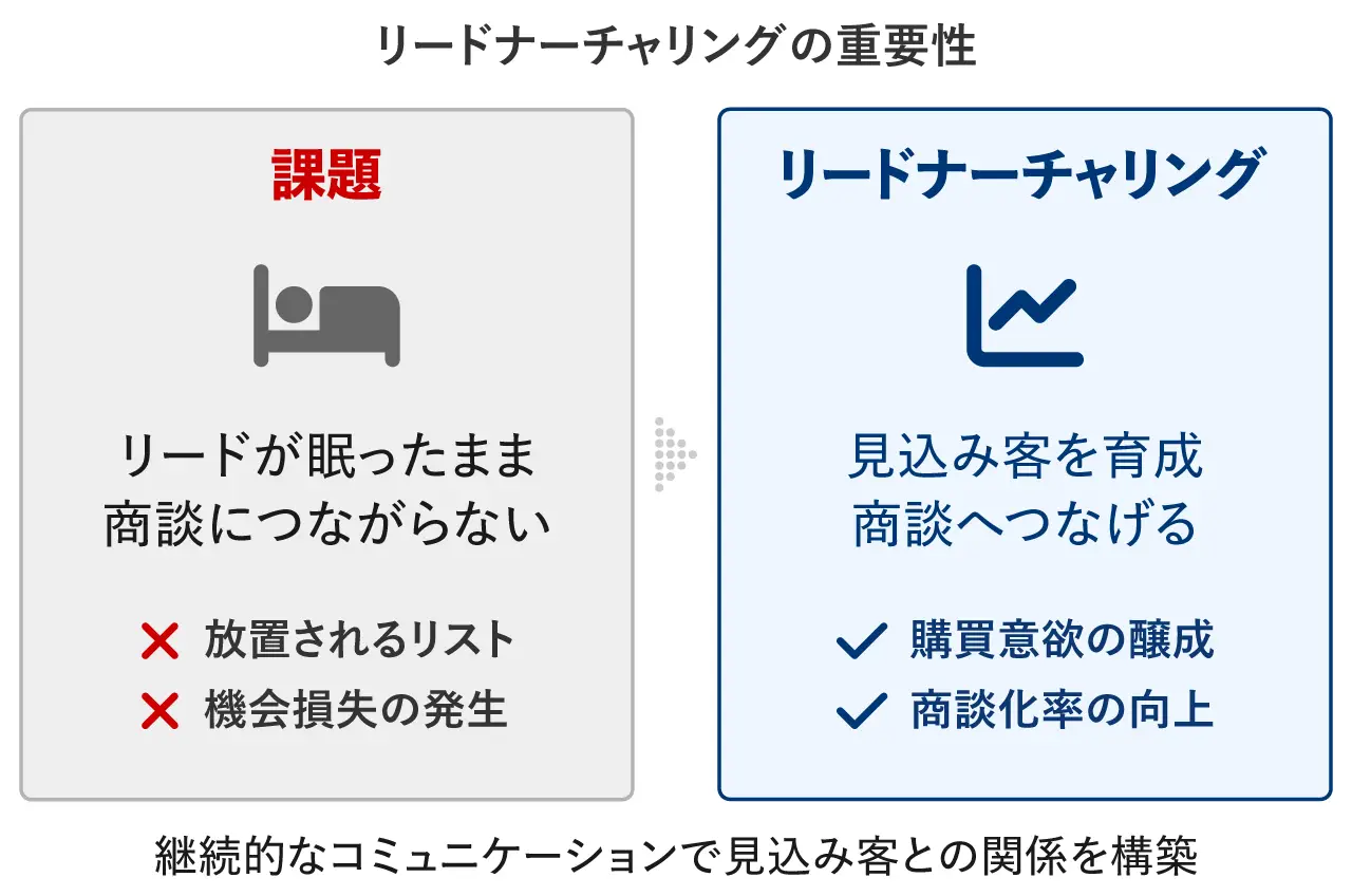 こうした背景から、リードナーチャリングはBtoB企業の売上向上に不可欠な取り組みです。インターネット時代の顧客主導の購買行動に対応し、長期にわたる複雑な検討プロセスを支える仕組みとして、その重要性は増すばかりです。