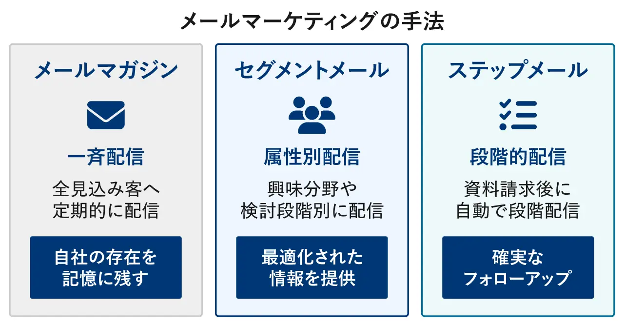 たとえば、一斉配信のメールマガジンは、全見込み客へ定期的に情報を届け、自社の存在を記憶に残すために役立ちます。