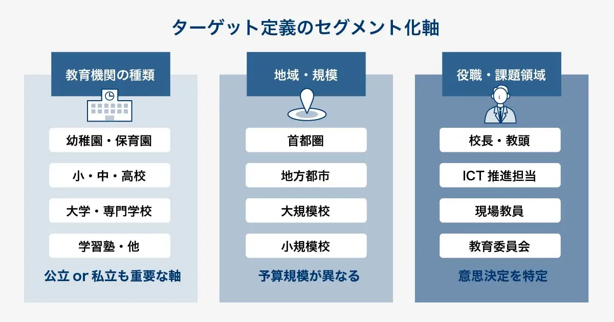 ターゲット定義では、教育機関の種類・地域・規模・役職・抱える課題領域などの軸でセグメント化すると、整理しやすくなります。