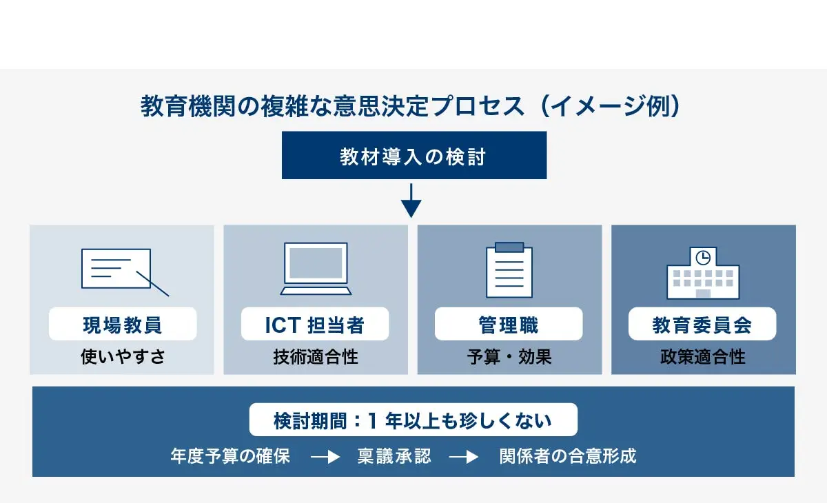 学校へのICT教材導入を例にとると、現場教員のみならず、ICT担当者・管理職・教育委員会など、多様な関係者が検討に加わります。