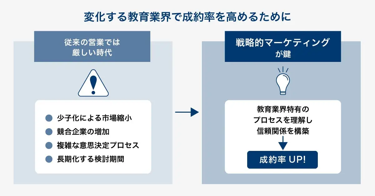 少子化による市場の変化や、競合の増加という課題があるなか成約率を高めるには、教育業界ならではの意思決定プロセスを深く理解した戦略的なアプローチが不可欠です。