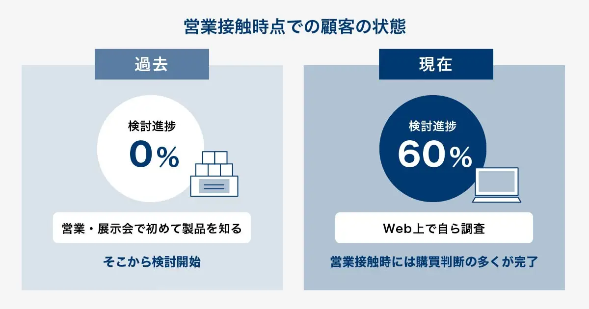 かつては、訪問営業や展示会を通じて製品情報を入手していました。現在は、営業担当者と対面する前に、Webサイト・オンライン広告・SNSなどを活用して比較検討が進んでいます。