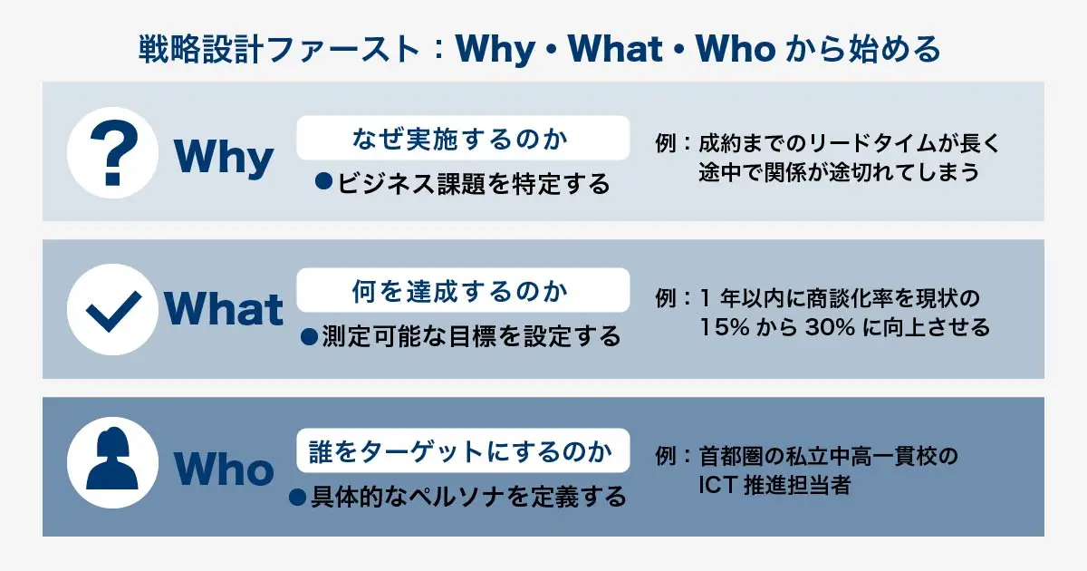 まずは、「Why(なぜこの施策が必要か)」「Who(誰をターゲットにするか)」「What(何を伝えるべきか)」を明確にする戦略設計が必要です。