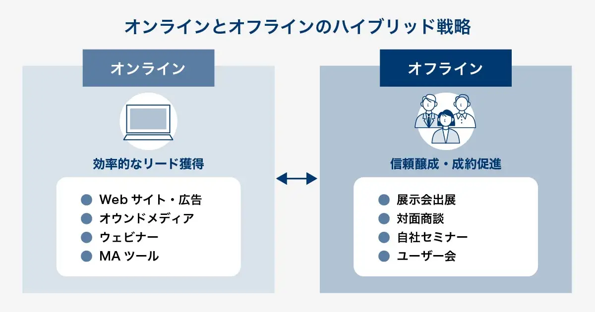 【ハイブリッド戦略の設計】 ・オンラインの強み:Web広告なら年齢層・地域・興味関心で詳細条件を絞り込むことができます。無駄な広告費を抑え、効率的に見込み客へ訴求できます。 ・オフラインの価値:最終的な信頼醸成や契約の詰めは、対面コミュニケーションが決め手になるケースが少なくありません。顔が見える関係を重視する傾向があります。 ・連携の効果:Webサイトで興味を引き、オフラインで確信に変えてもらう流れや、展示会で顧客の声を聞き、その後ウェビナー招待につなげる連携が効果的です。 |