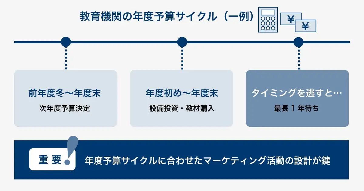 年度予算のサイクルに合わせたキャンペーン展開、補助金情報の提供、柔軟な導入スケジュールの設定など、相手のカレンダーに合わせてマーケティング活動をデザインすることが鍵となります。