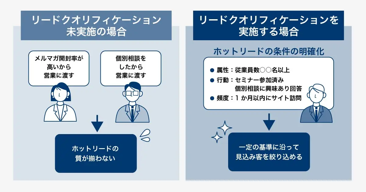 リードクオリフィケーションを実施すると、自社のホットリードの定義が明確になり、営業に渡す見込み客の基準を揃えられるようになります。