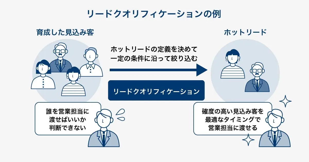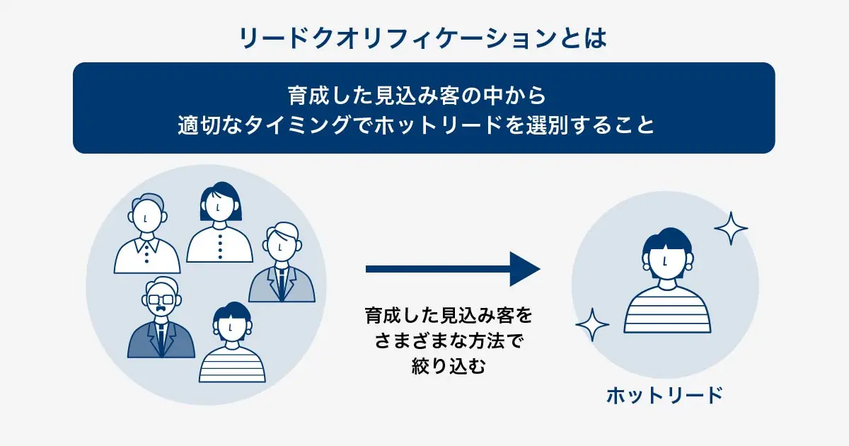 リードクオリフィケーションとは、育成した見込み客のなかから適切なタイミングで営業に渡すためのホットリード(購買意欲の高い見込み客)を選別することです。