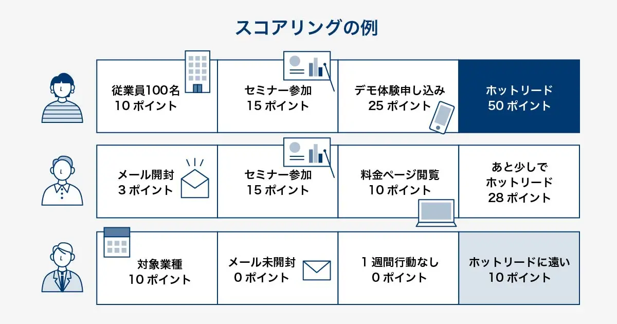 また、スコアリングでは、下記のように見込み客の属性や行動を点数化して、ホットリードとなる点数に達する見込み客を絞り込みます。
