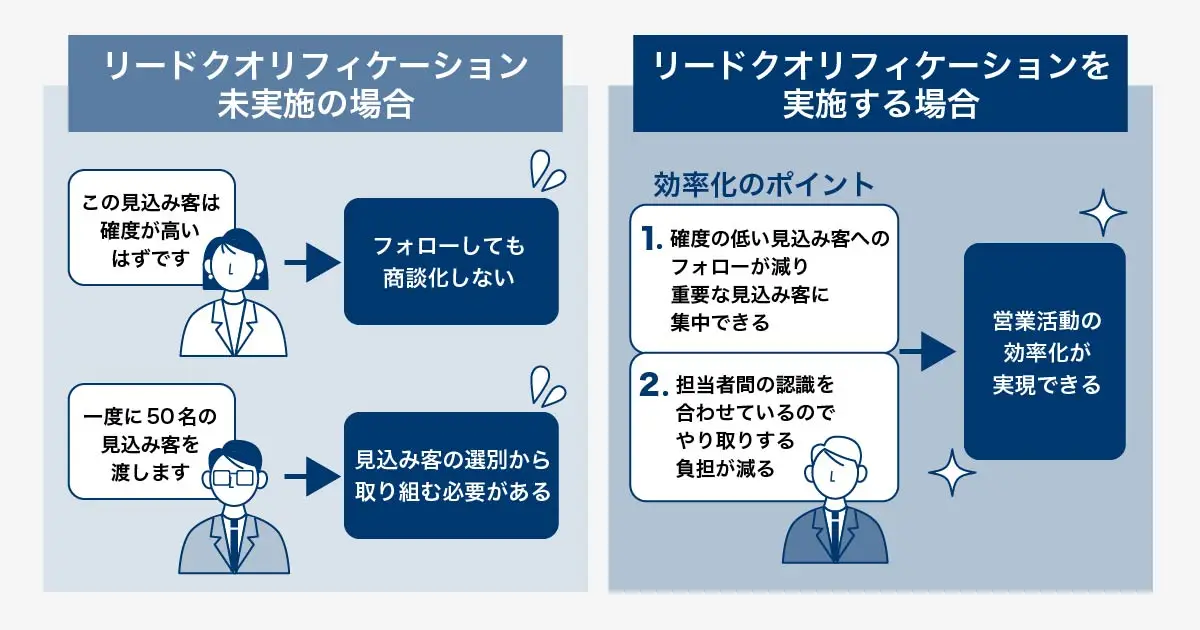 リードクオリフィケーションをすると、営業担当者は一定の基準を満たした見込み客のみをフォローすればよくなるので、確度の低い見込み客への提案やフォローをする時間を削減できます。