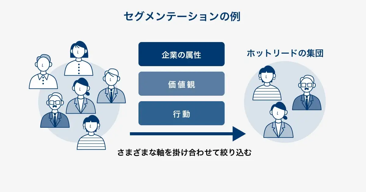 例えば、セグメンテーションでは、見込み客を企業の属性や価値観、行動などで分類して、ホットリードの条件に該当している見込み客を絞り込みます。