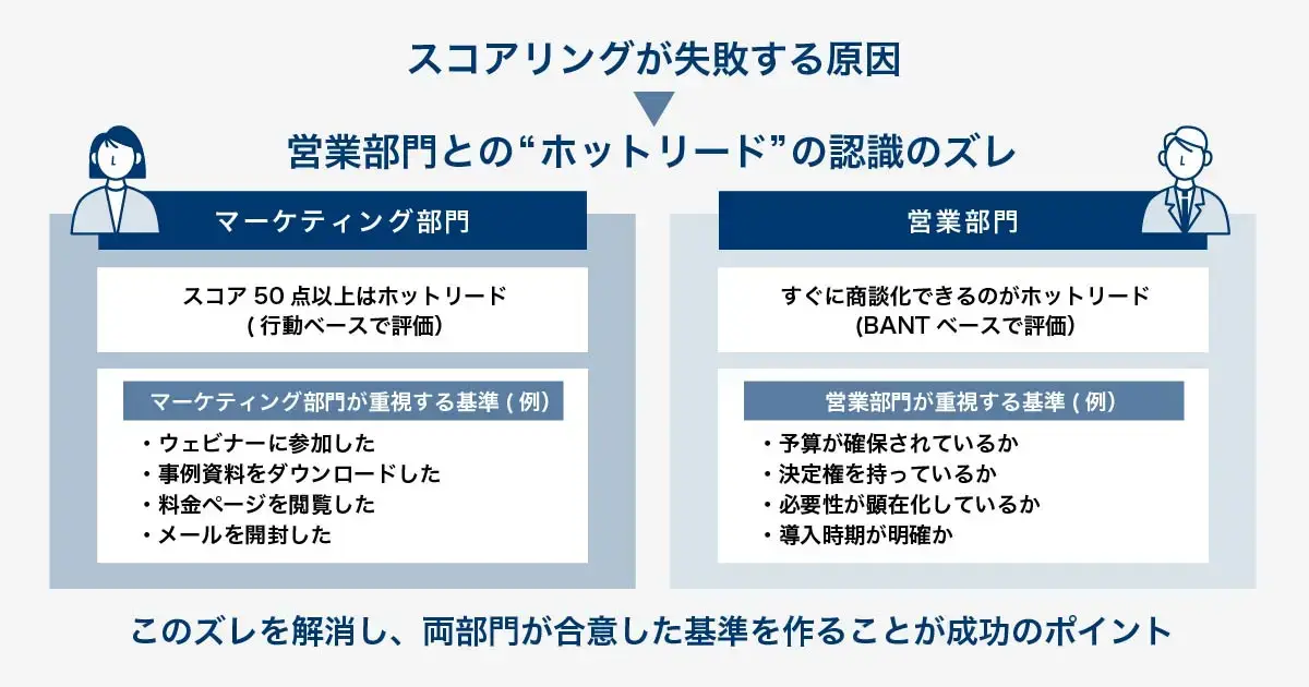 スコアリングが形骸化する最大の原因は、マーケティングと営業の間で「ホットリード」の定義が共有されていないことです。この認識のズレをなくし、組織としての共通言語を定めることが、連携における最初のステップとなります。