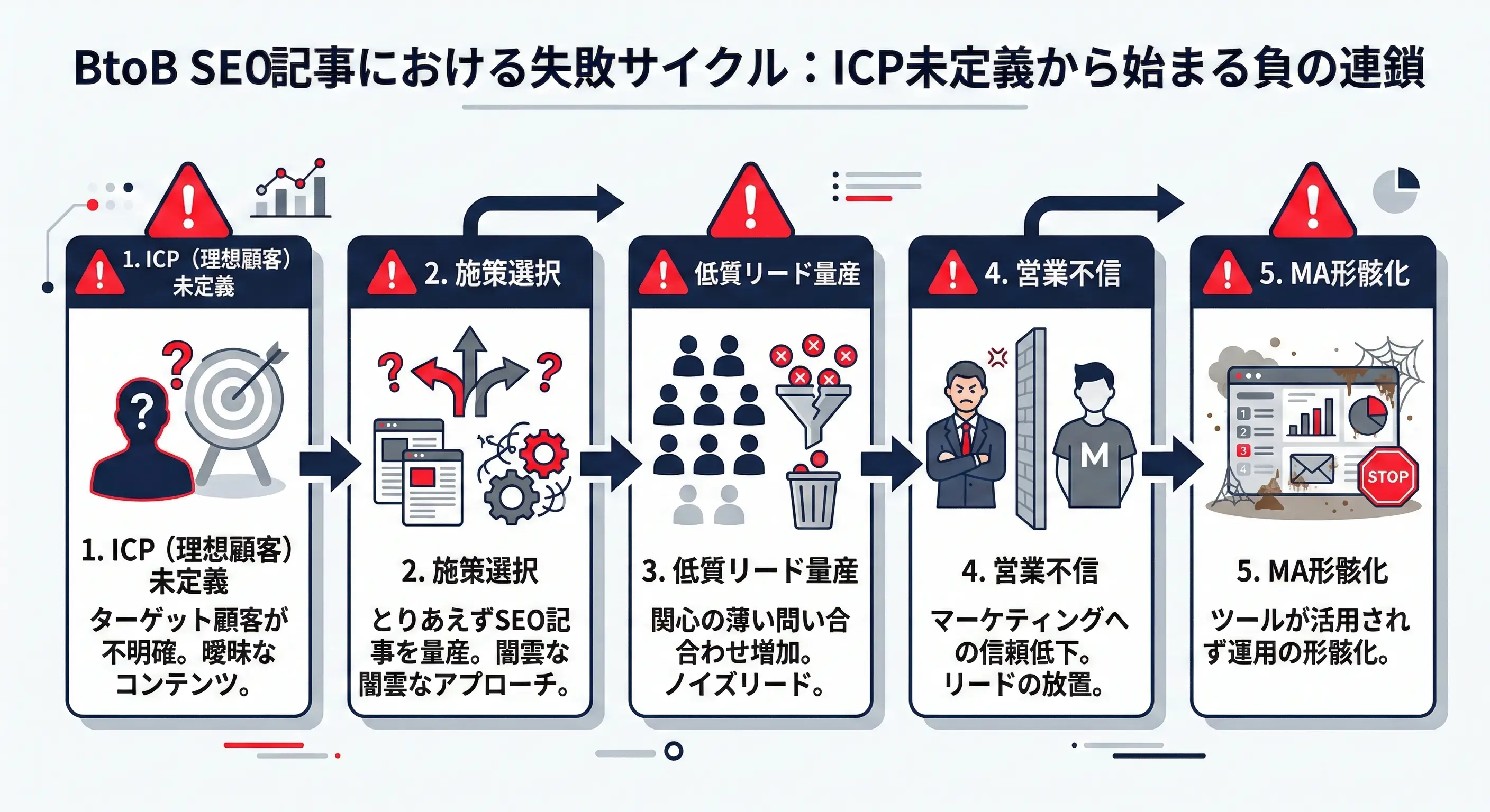 - Gemini nano banana用プロンプト: 「BtoB向けSEO記事用のフロー図。STEP1(ICP定義)→STEP2(チャネル選定)→STEP3(MA設計)→STEP4(ナーチャリング)→STEP5(KPI・PDCA)の5ステップを横並びの矢印フローで表現。各ステップをアイコン付きボックスで表示。ネイビー基調のシンプルでプロフェッショナルなフラットデザイン。」