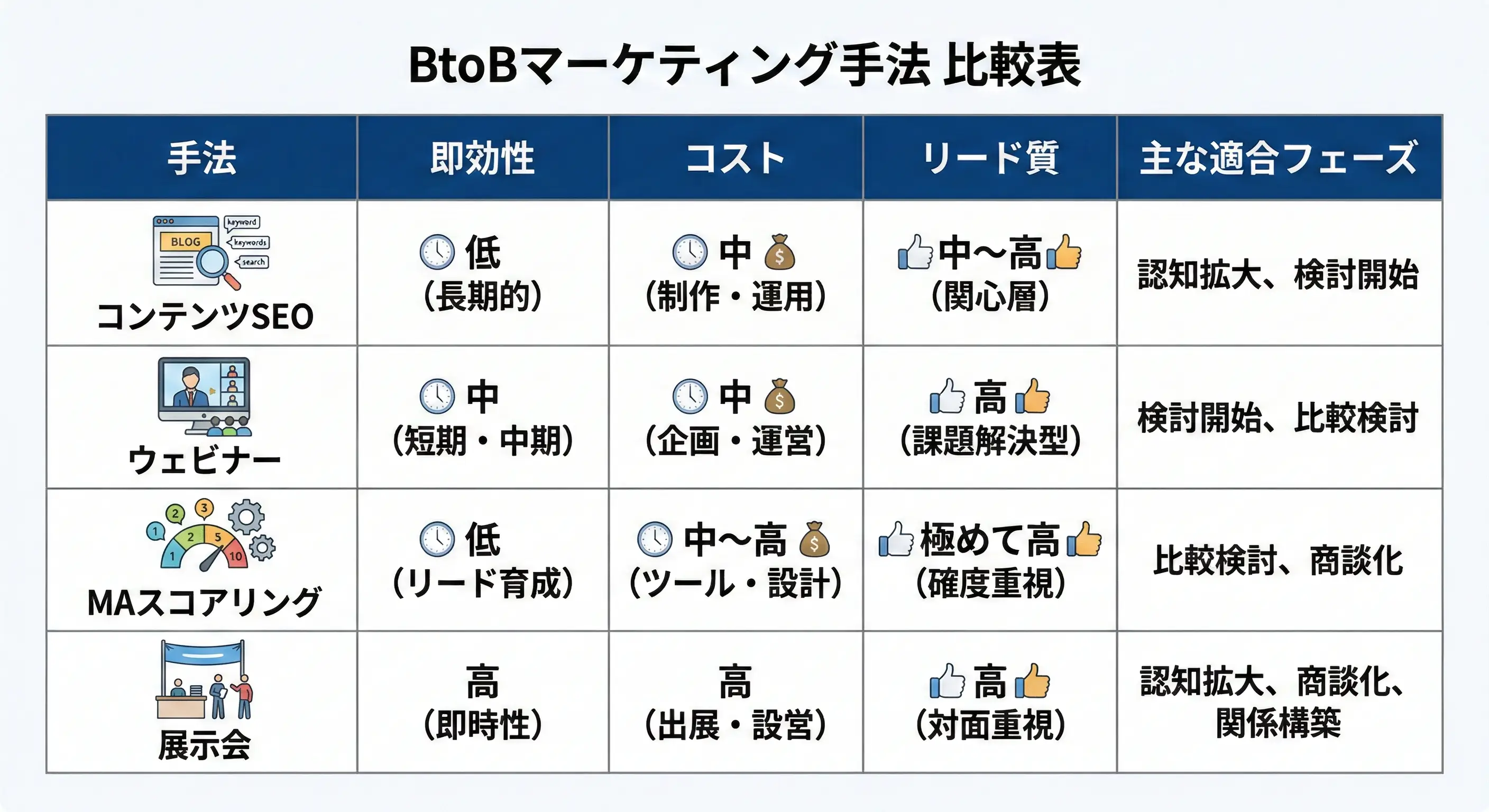 重要なのは、「すべての施策を並行して走らせない」ことです。リソースが限られる中でSEO・広告・展示会・ウェビナーを同時に始めると、すべてが中途半端になります。