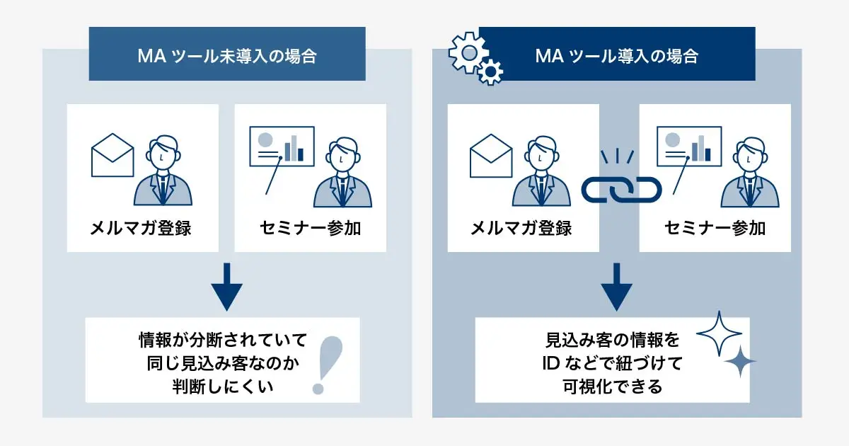 このように、MAツールでは、今まで点在していたデータをつなげて可視化できるため、顧客理解を深めたうえで最適なアプローチを検討できるのです。