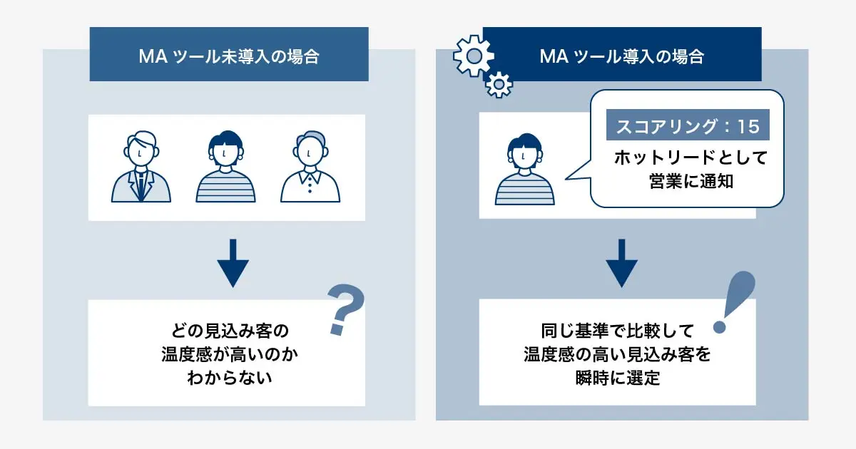MAツールを導入すれば、スコアリングで見込み客の温度感を可視化できます。そのうえで、一定のスコア以上を持つ見込み客のみを営業に引き継ぐことが可能です。