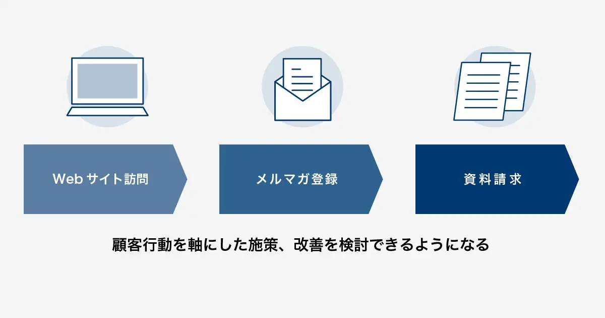 一例として、見込み客がWebサイトを訪問してメルマガ登録をして、その後に資料請求をする行動傾向があるとしましょう。