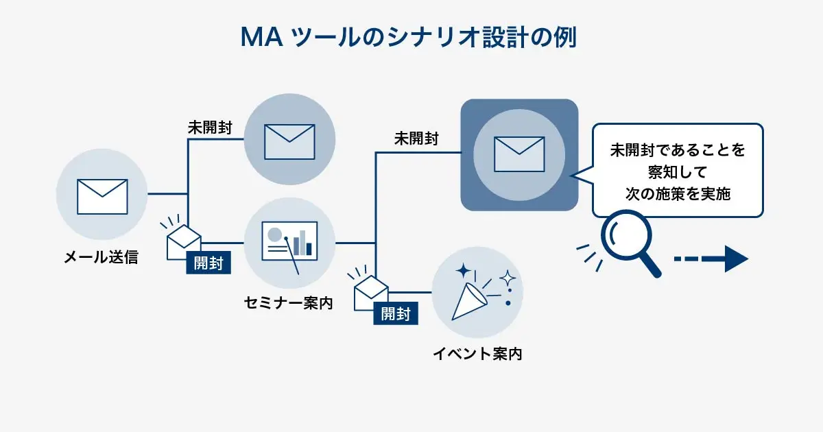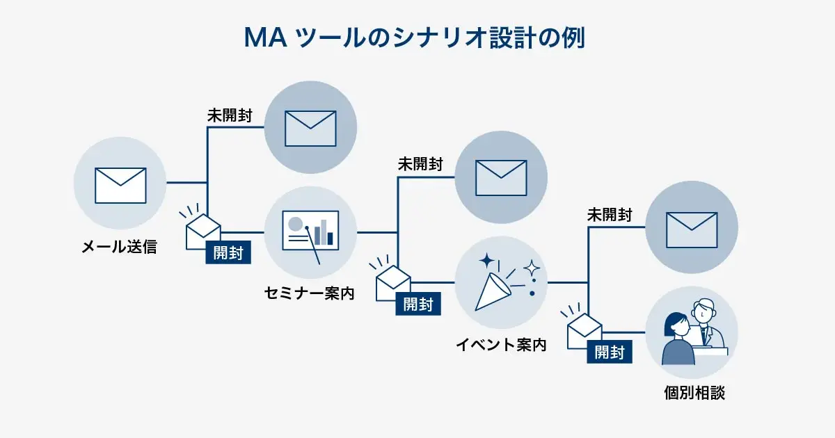 例えば、MAツールのシナリオ設計では、セグメントした見込み客ごとに特定の行動をしたときのアクションを決めておくことが可能です。