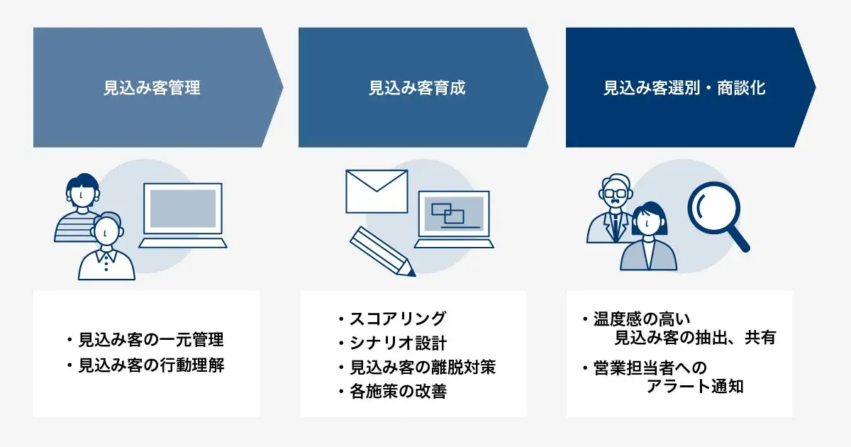 ・優先度の高い見込み客が明確になる ・手間をかけずに接点を継続できる ・見込み客の離脱を察知して対策できる ・PDCAを回して施策を改善できる |
