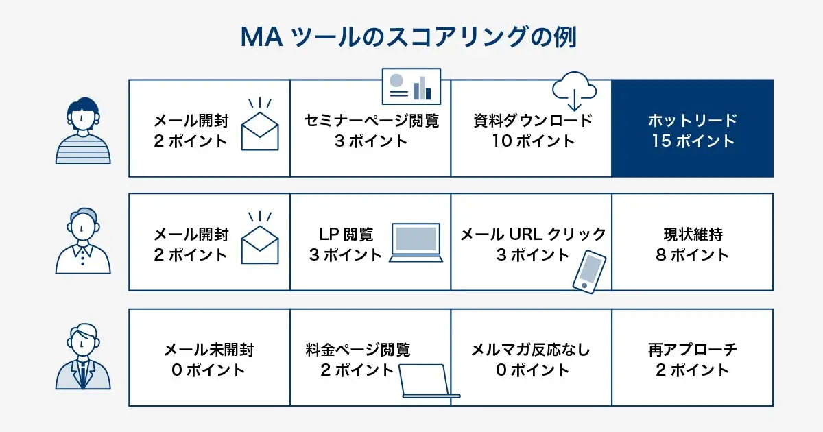 例えば、下記のように見込み客の行動を点数として付けていくと、一定以上の点数を獲得できる見込み客が可視化できます。