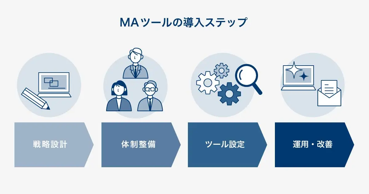 MAツールは、単にツールを選定して導入すれば成果が出るわけではありません。下記のステップに沿って戦略設計から運用まで計画的に進めることが重要です。