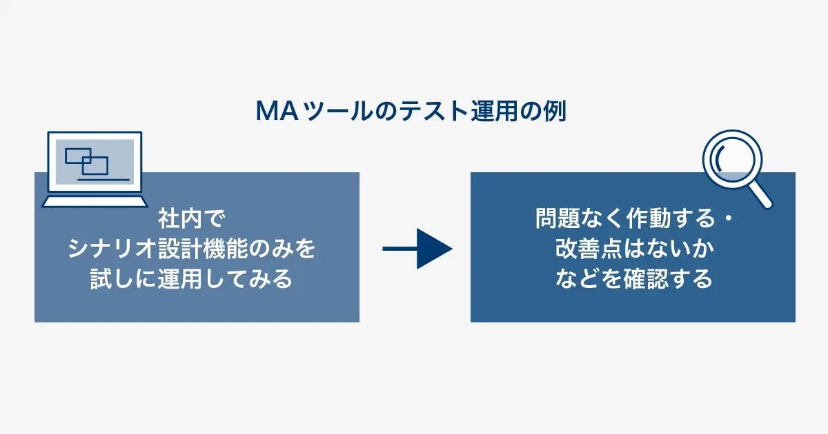MAツールの初期設定が完了したら、テスト運用を開始します。急に全フェーズにMAツールを導入すると、トラブルが起きたときのリスクが大きくなるためです。