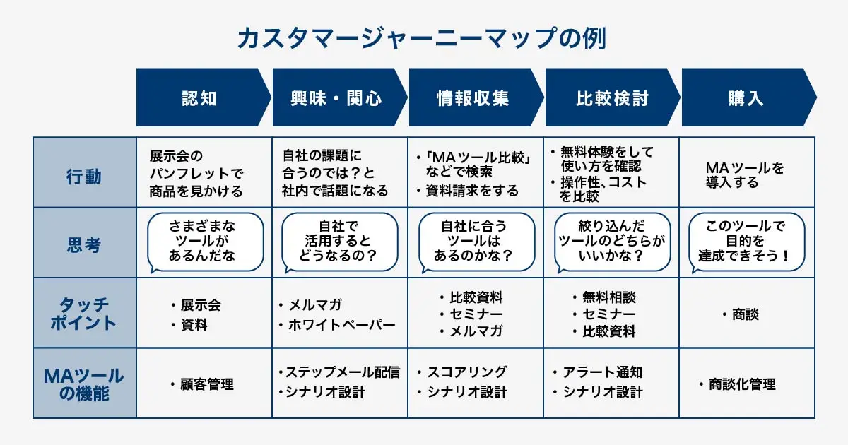 一例として、下記のようなカスタマージャーニーマップを作成すると、どのタイミングでMAツールを活用し、どのような機能が必要となるのか可視化できます。