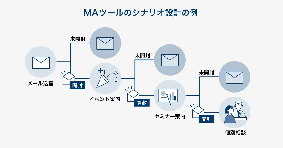 下記のように、まずはメールを配信して開封した見込み客にはセミナー案内をする、セミナー案内を開封した見込み客にはイベント案内をするなど、見込み客の行動に応じたフォローを自動化できます。
