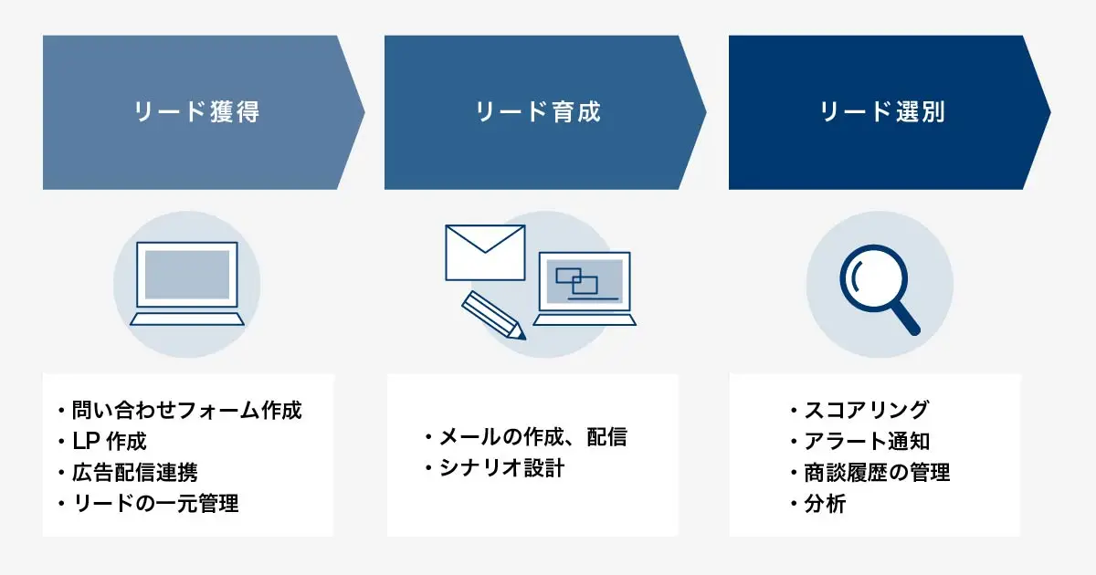 まずは、MAツールの基本的な機能を把握しておきましょう。MAツールは見込み客の獲得から育成、商談化までの各フェーズで活用できる下記のような機能が揃っています。