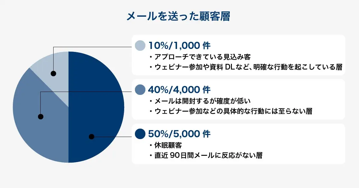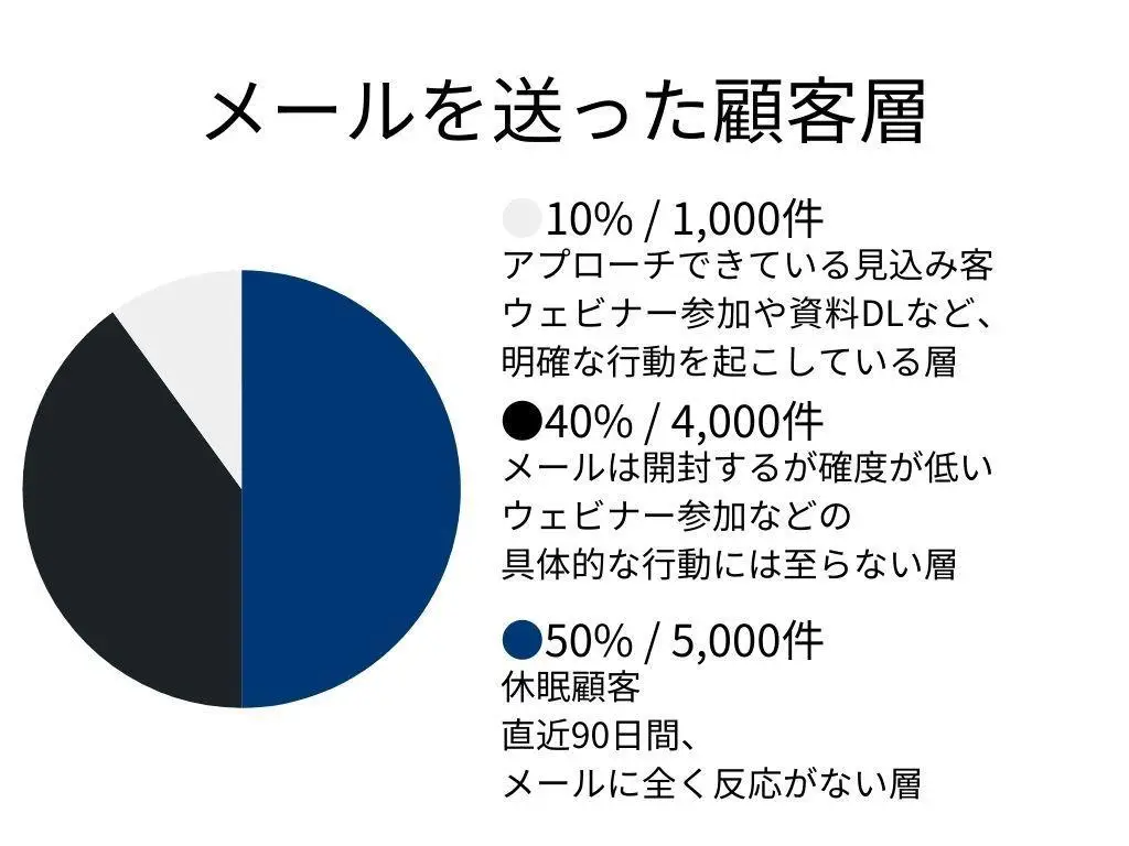 仮にアプローチリストが1万件あったとしても、直近90日以内にメールを開封するなど、活動的な顧客はその半分にも満たないことが多いでしょう。