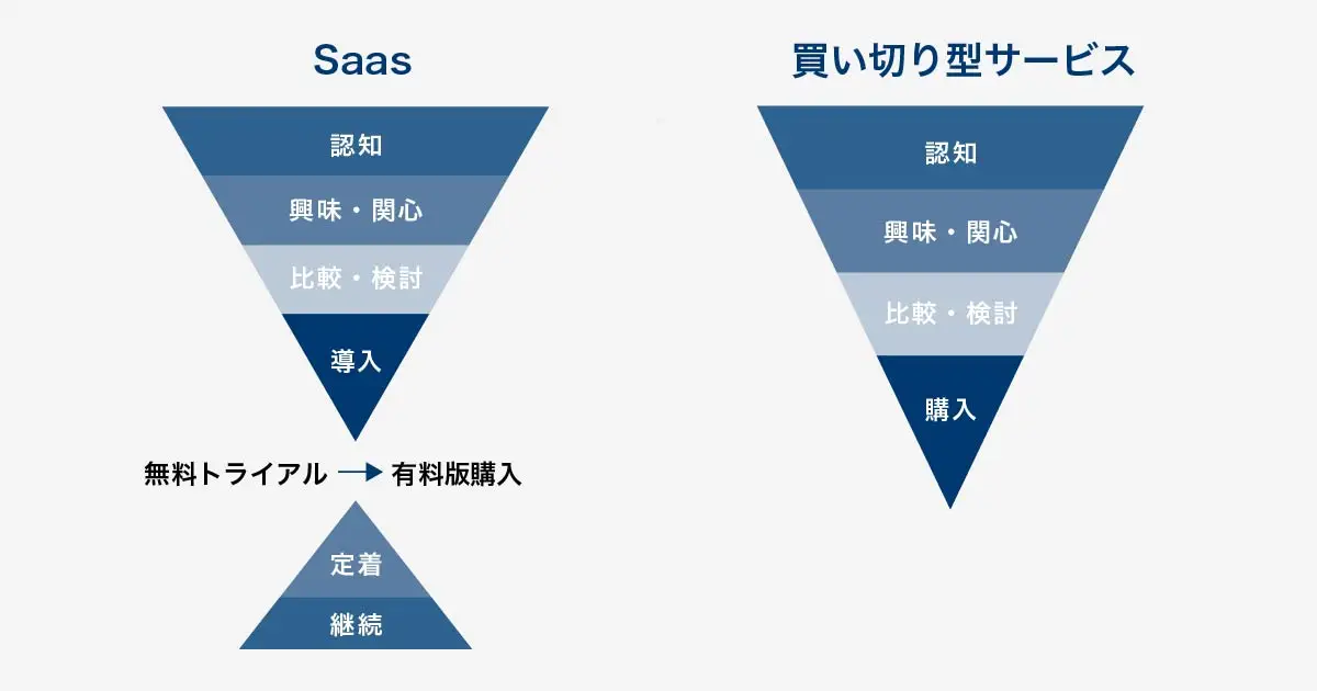 【SaaSとその他買い切り型サービスのファネル比較(一例)】