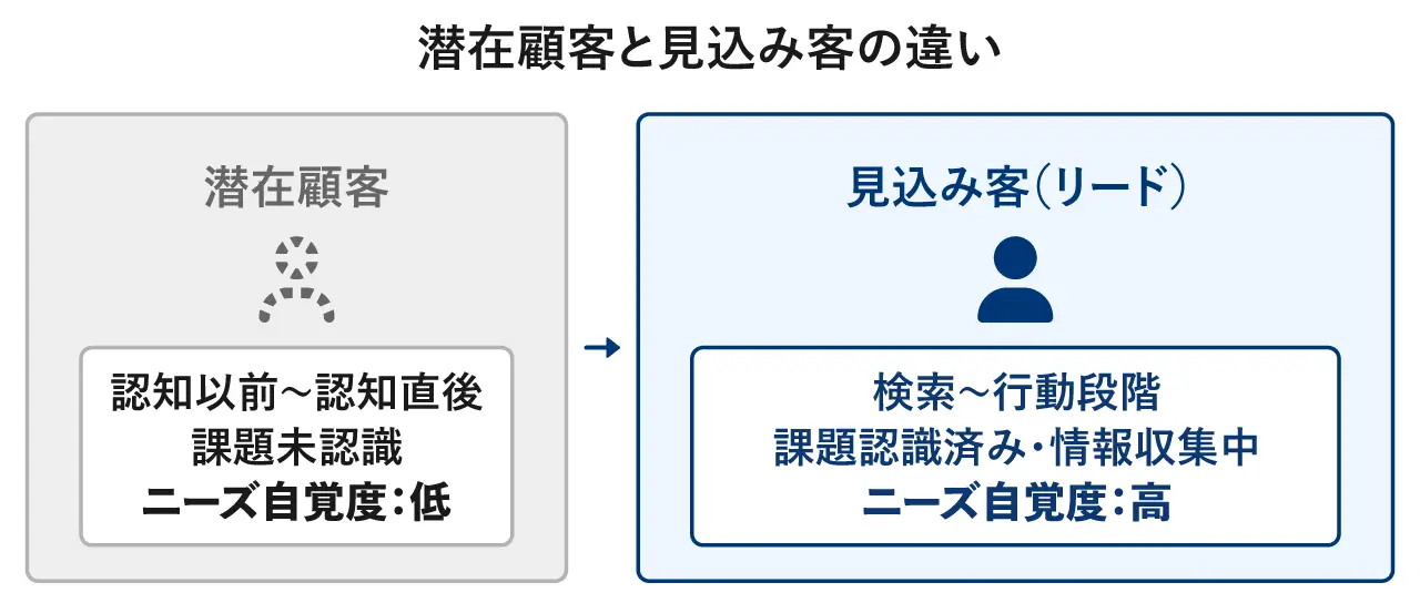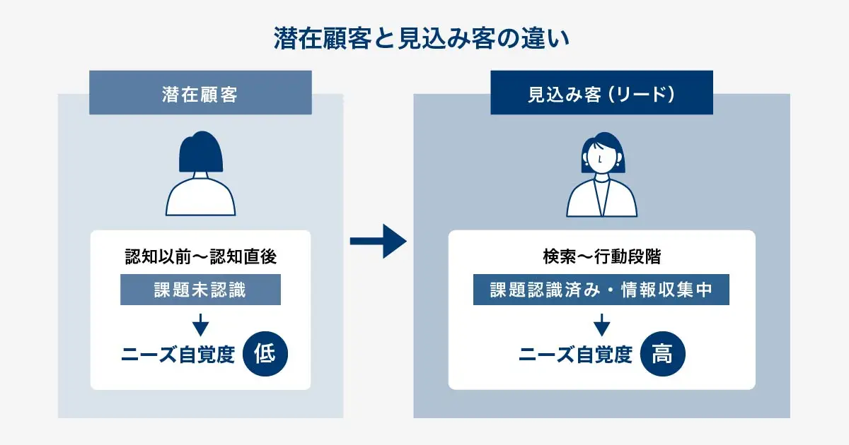 両者の決定的な違いは、ニーズの自覚度にあります。見込み客とは、認知・興味関心・比較検討など、購入に至るすべての前段階を含む、広い概念です。