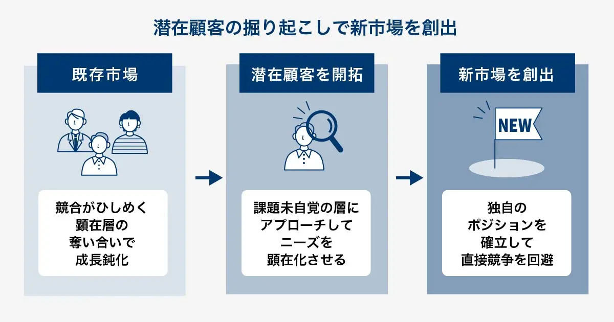 潜在顧客の掘り起こしは、新規市場の創出にもつながります。潜在顧客はまだ「顧客候補」でしかありませんが、それだけに一定数を自社顧客化することに成功すれば、独自の新市場を形成できる可能性があります。
