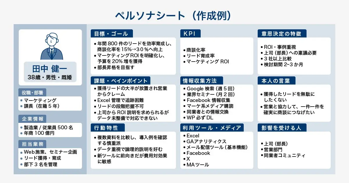 【効果的なペルソナ設定の要素】 ・具体的な人物像を作成する:名前・年齢・職業・役職・年収・家族構成・趣味嗜好・抱える課題などを設定します。「マーケティング部に勤める38歳男性。在籍5年で課長。新規リードの育成に悩んでいるが具体策がわからず模索中」といった具合に、実在するかのように感じられるレベルまで肉付けすることが重要です。 ・データに基づいて精度を向上させる:既存顧客や過去の商談リードのデータを、ペルソナ設計の材料として活用します。営業担当へのヒアリング、アンケート調査、ウェブのアクセス解析結果などを収集し、潜在顧客となり得る人の共通点を抽出しましょう。 ・顧客目線(ペルソナ目線)で施策を検討する:ペルソナが定まれば、「この人なら何に興味を持つだろうか」と顧客目線で具体的に想像できるようになります。たとえば「朝の通勤電車でスマホニュースをチェックする習慣がある」ペルソナなら、SNS投稿は朝7〜8時台に配信するといった判断が可能です。 |
