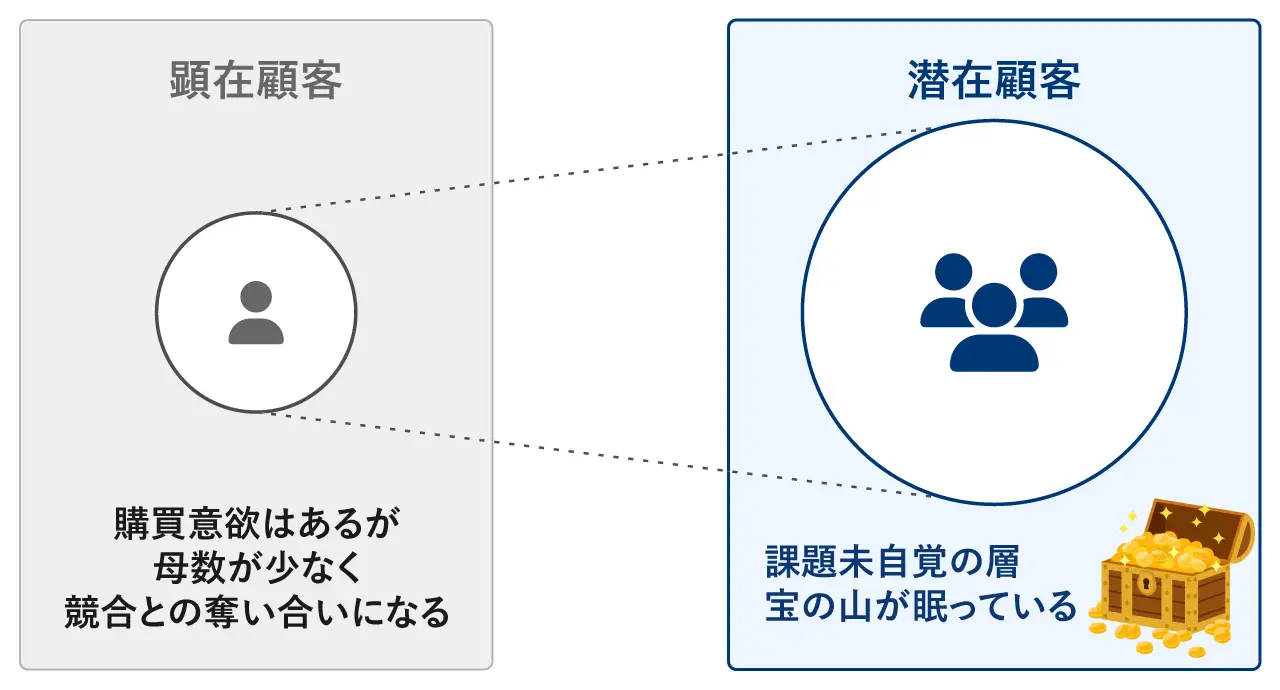 企業側から見ると、潜在顧客は市場に現れていない “隠れた需要層” です。その動向をつかみにくい一方で、適切なアプローチによってニーズを顕在化させ、顧客化できる余地がきわめて大きい層といえます。