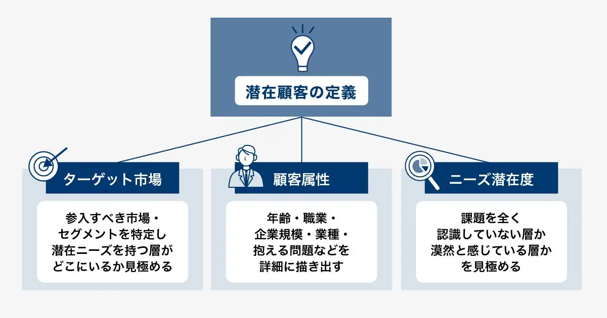 次に、自社にとっての「潜在顧客」を具体的に定義しましょう。企業によって製品やサービス、市場環境が異なるため、「誰が潜在顧客に当たるのか」を明確にしなければ、効果的な施策は打てません。