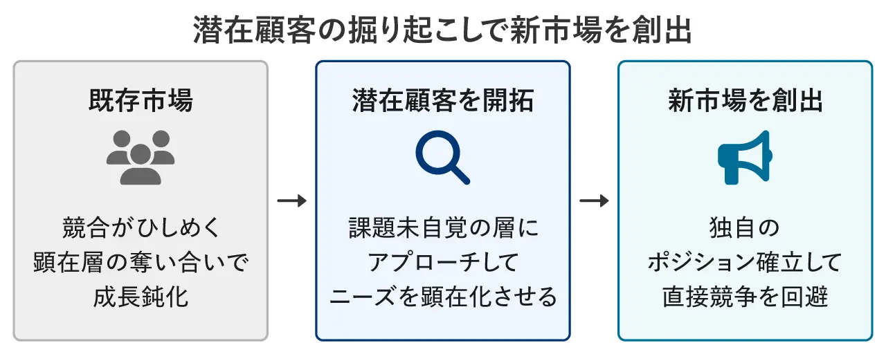 潜在顧客の掘り起こしを通じた新市場の創出は、大きな価値を持ちます。他社との直接競争を避けて、独自のポジションを築けるからです。