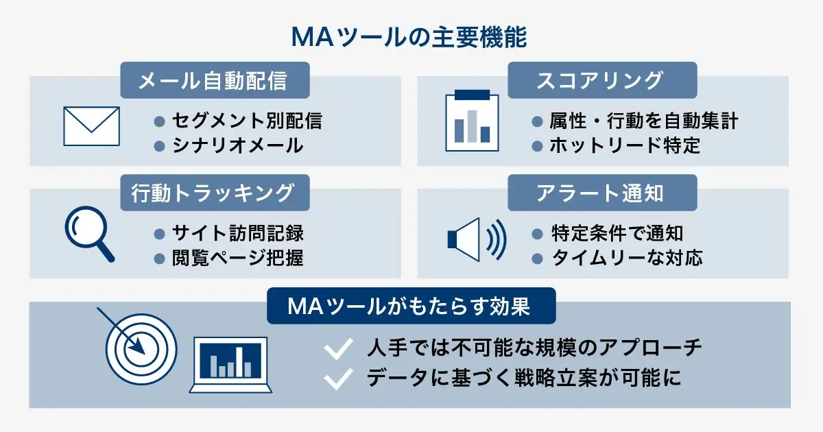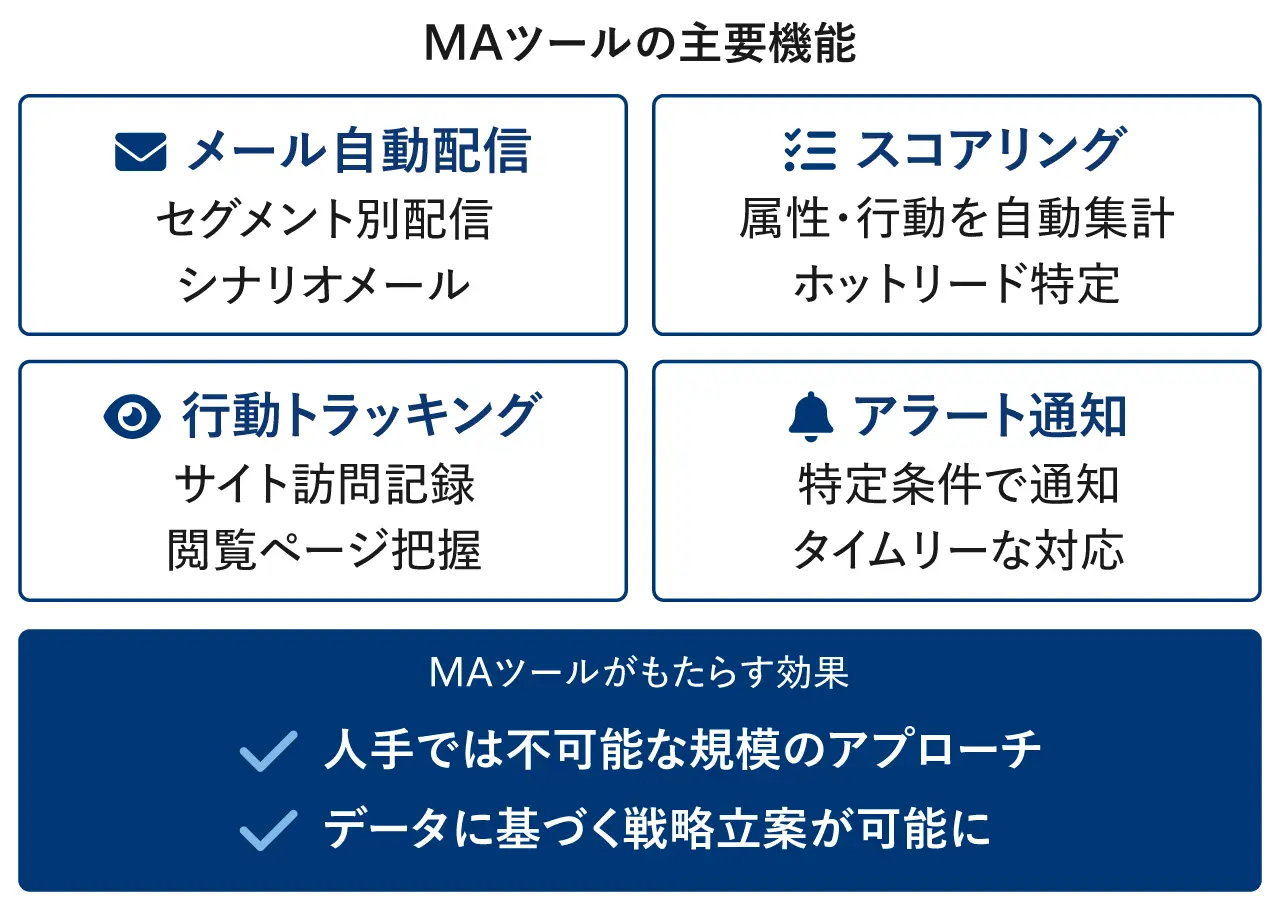 MAツールでは、自動メール配信、スコアリング(見込み度合いの点数化)、Web行動トラッキングなどが一元的に行えます。担当者が手作業でフォローするよりもはるかに効率的に、適時適切なコミュニケーションを実現できます。