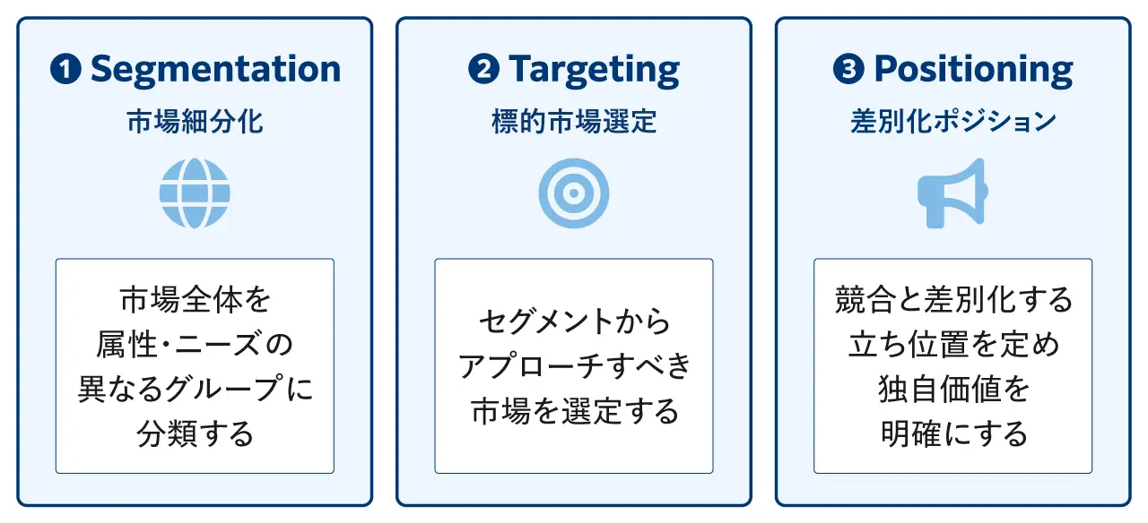 まずは、市場やターゲットを絞り込むために、STP分析を実施します。STPとはSegmentation(市場細分化)・Targeting(標的市場の選定)・Positioning(差別化ポジショニング)の頭文字で、マーケティング戦略立案の基本プロセスです。