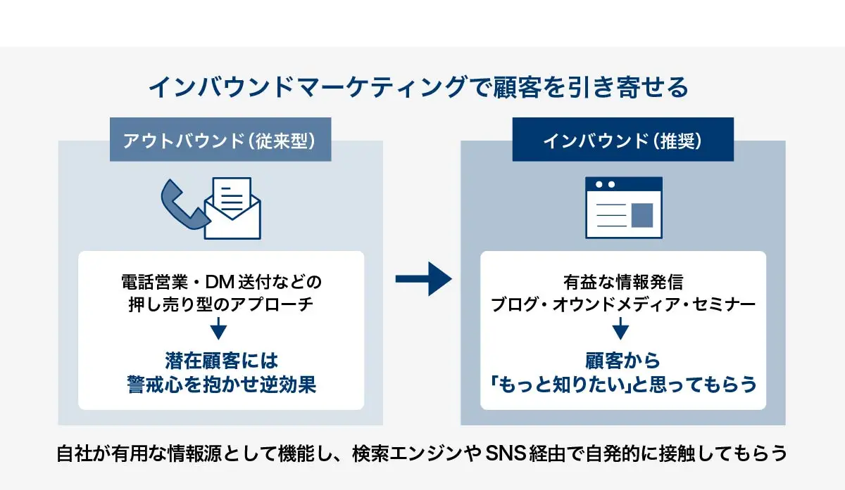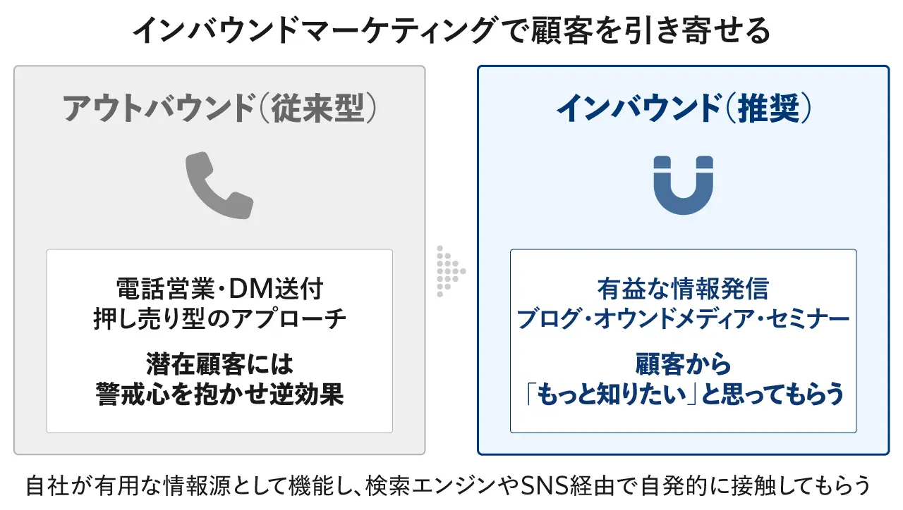 潜在顧客へのアプローチでは、強引な売り込みよりも、インバウンドマーケティングの考え方を軸に据えることが重要です。インバウンドマーケティングとは、顧客側から自社に興味を持ってもらえるよう有益な情報発信で引き寄せる手法です。