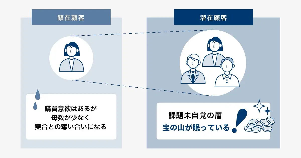 企業側から見ると、潜在顧客は市場に現れていない “隠れた需要層”です。その動向をつかみにくい一方で、適切なアプローチによってニーズを顕在化させ、顧客化できる余地がきわめて大きい層といえます。