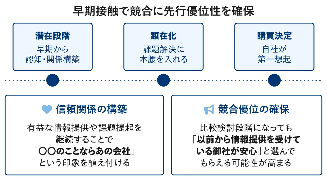 たとえば競合商品と比較検討する段階になっても、「以前から情報提供を受けている御社の製品が安心だ」と自社を選んでもらえる可能性が高まります。潜在顧客との早期接触は、将来の競争優位を確保する投資です。