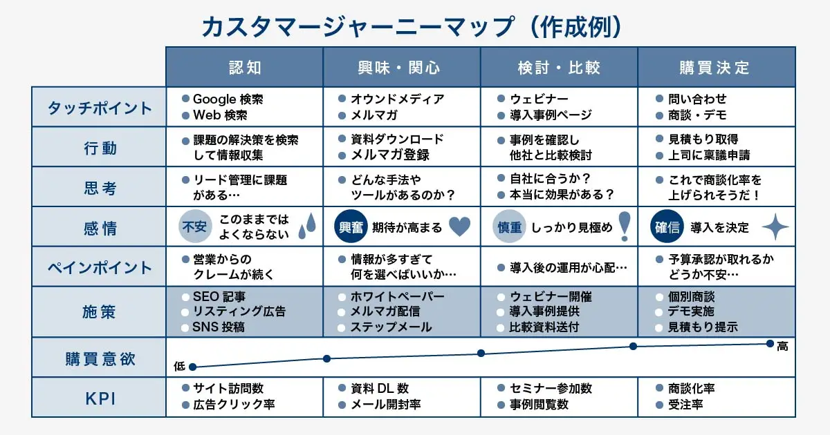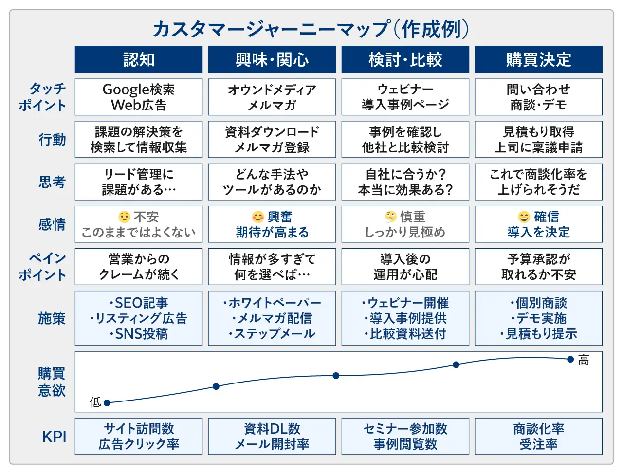 ペルソナを設定したら、そのペルソナが自社を知り、最終的に顧客となるまでの思考・行動プロセスを図解したカスタマージャーニーマップを作成します。カスタマージャーニーマップとは、見込み客が課題を認識してから購入に至るまでの旅路を可視化したものです。